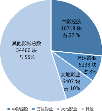 截止2018年底,中國排名前三的院線公司影院數、銀幕數、票房占市場份額百分比情況